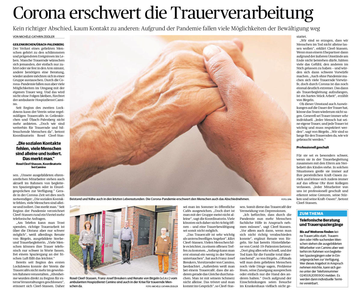 Trauerspaziergang jeden 3. Freitag im MonatAn jedem 3. Freitag im Monat besteht in Geilenkirchen um 16.00 Uhr die Möglichkeit zu einem begleiteten Trauerspaziergang. Treffpunkt ist der Parkplatz an Burg Trips. Die jeweils aktuellen Coronaschutzregeln werden beachtet.Bitte melden Sie sich telefonisch bis spätestens 2 Tage vor dem Spaziergang unter 02451 6209-5900 an.Trauerwanderung jeden 1. Sonntag im MonatDauer 10.00–14.00 Uhr. Die Wanderung erstreckt sich über einen Rundweg von etwa 12 km und startet an wechselnden Orten. Um Rucksackverpflegung und Anmeldung wird gebeten.Trauercafé GeilenkirchenAn jedem 2. Freitag im Monat, 16.00 Uhr im Bürgerhaus Bauchem,Pestalozzistraße 33.Trauercafé Übach-PalenbergAn jedem 4. Freitag im Monat, 15.30 Uhr im MehrgenerationenhausKonrad-Adenauer-Platz 1.